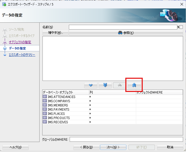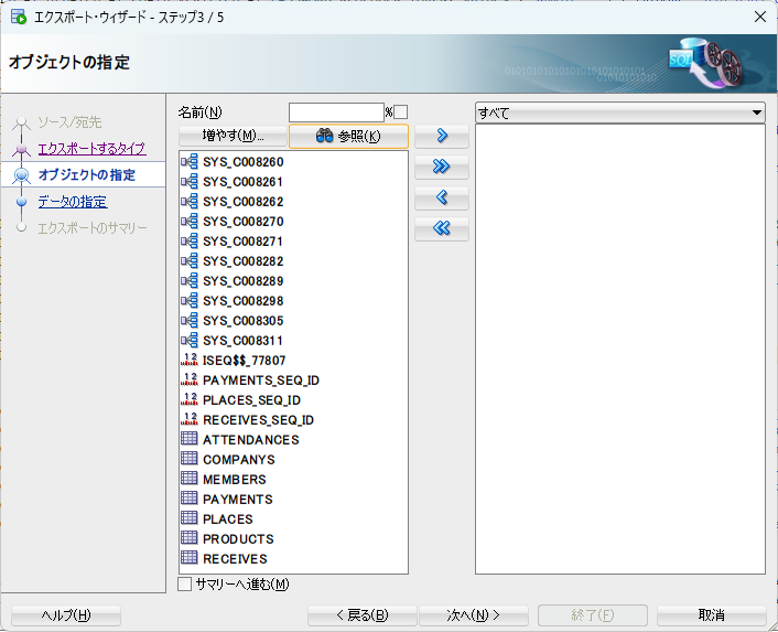 「オブジェクトの指定」では、テーブルやSEQUENCEといったオブジェクトを選択します。