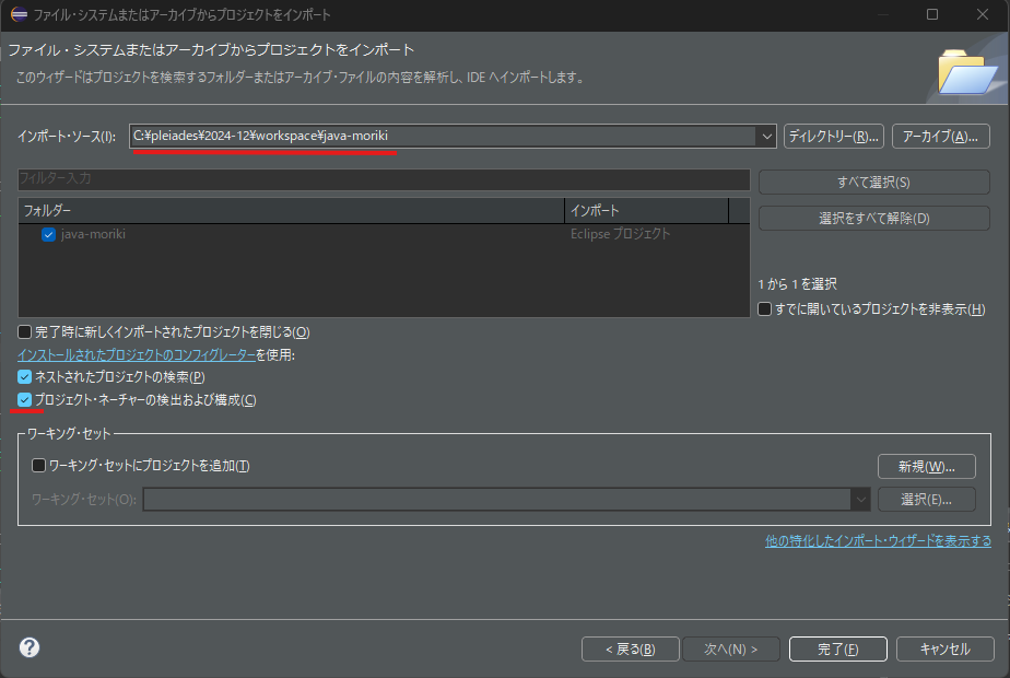 ・「インポート・ソース」に、「ディレクトリー」より対象のプロジェクトを選択する