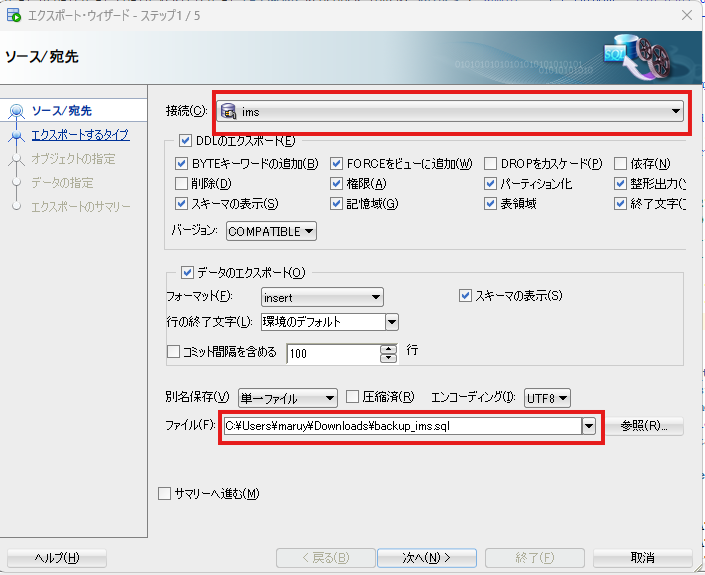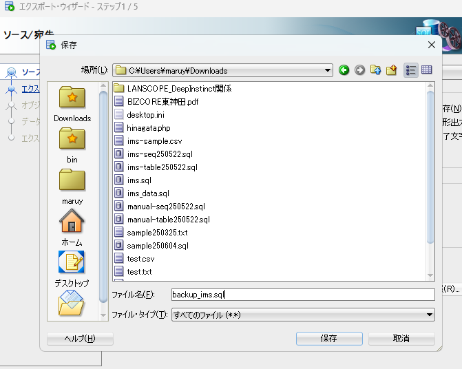 …どこにsqlファイルをダウンロードするかを指定するので、参照からDownloadsフォルダを選択し、わかりやすいファイル名を付けましょう。下図では「backup_ims.sql」としています。