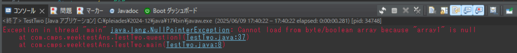 また、:に続く英文(Cannot load from byte/boolean array because “array1” is null)が具体的なエラー内容のため、翻訳して意味を読み取る。