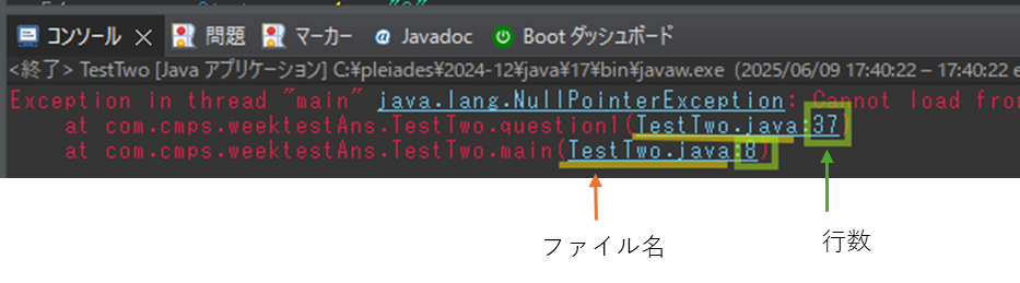 下図の場合なら、一番最初の「java.lang.NullPointerException」の意味を調べる。