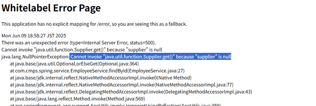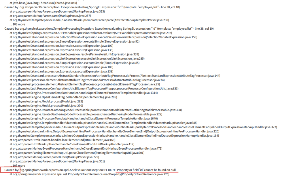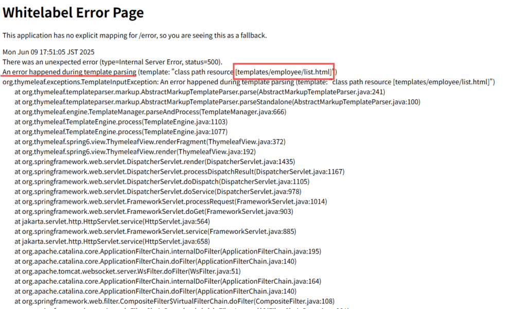 ※テンプレート上:Thymeleafとしての記述エラー、またはThymeleafへ渡した変数の中身とThymeleaf上の記述が噛み合わないことによるエラー。(例:idというフィールドを持たないobjectに対して*{id} と記述している等)