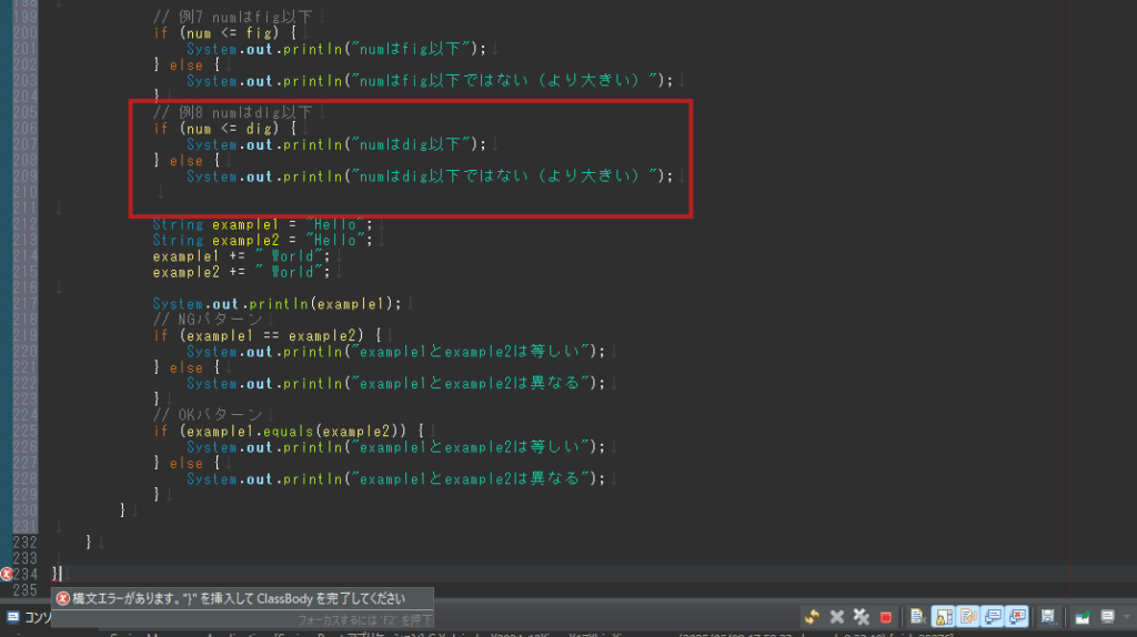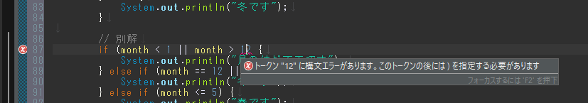 下図の場合、赤い枠のif文について足りていませんが、Classの閉じブロック”}”の部分にエラー表示が出ています。