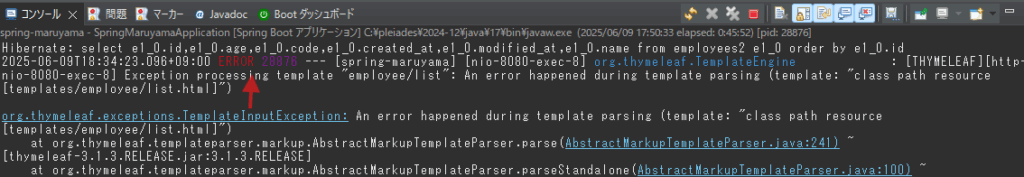 「An error happened during template parsing・・」といった記述がある場合、テンプレート(Thymeleafの処理)に関するエラーです。原因のHTMLファイル名も示されています。