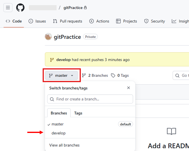 プッシュ後、リモートリポジトリのWebページを更新すると、下図のプルダウンからブランチを選択して表示できるようになっています。