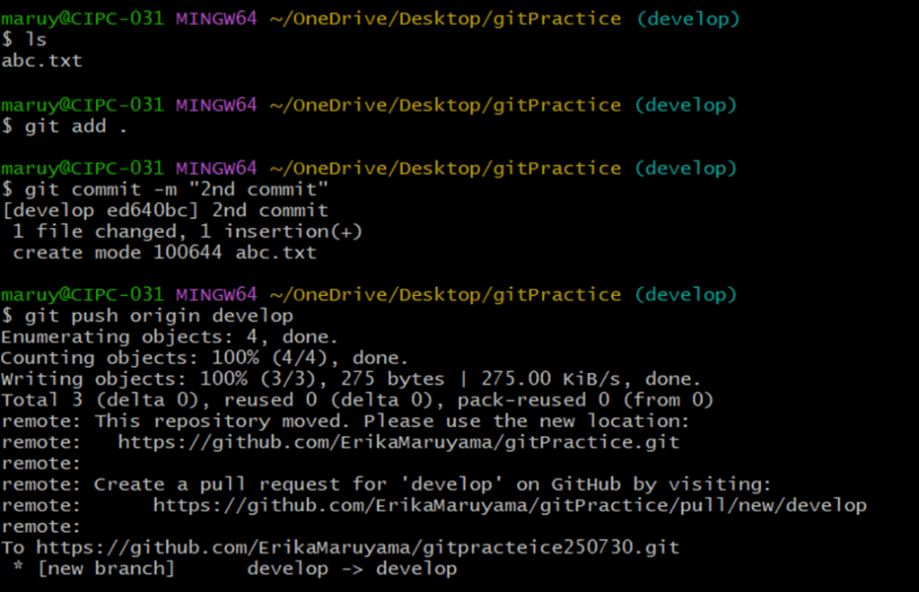 ・git add ~git pushまでを、コミット名”2nd commit”で実行しています。(ローカルのdevelopブランチから、リモートのdevelopブランチへプッシュ)