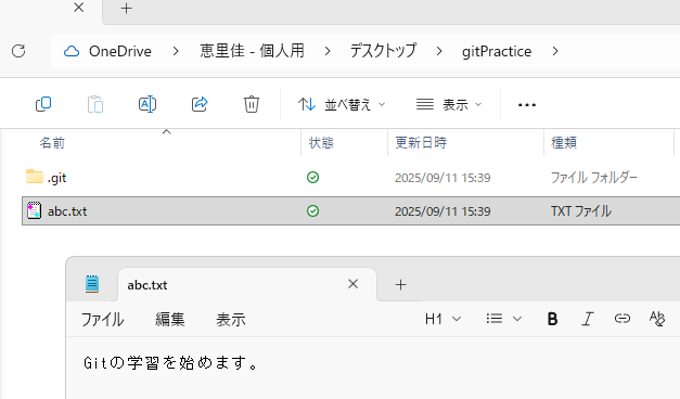 ・ファイルには「Gitの学習を始めます。」と記載しておきます。