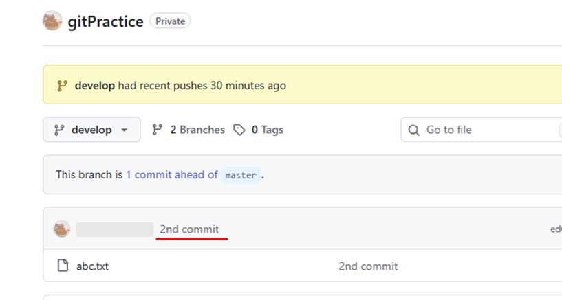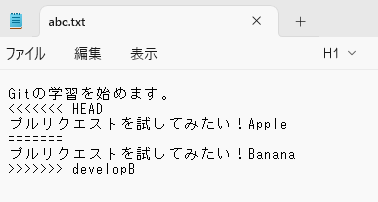 developブランチに切り替え、「abc.txt」に以下のように追記した後、プッシュしてください。