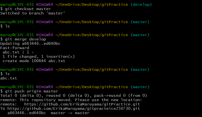 作成したdevelopブランチが表示されていること、現在はmasterブランチにいることが分かります。