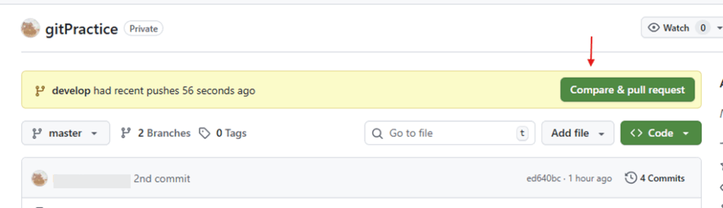 プッシュ後、GitHubを開くと、画面上部にプルリクエストを促す通知が表示されています。このボタンをクリックするか、