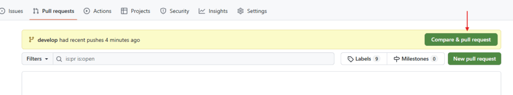 または、画面上部のPull Requestsタブからも同様にボタンがあり、こちらからも進めることが出来ます。