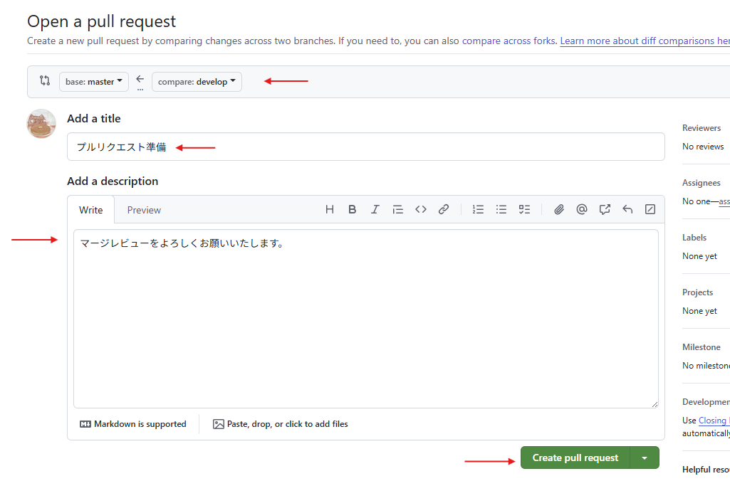 ボタンクリック後のプルリクエスト画面では、マージ元とマージ先ブランチ、タイトルやメッセージを編集し送信することが出来ます。