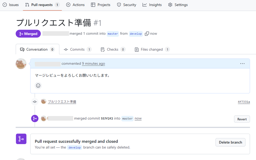 プルリクエストに対するマージの承認も、GitHub上で実行できます。右の画像はマージ完了後の表示