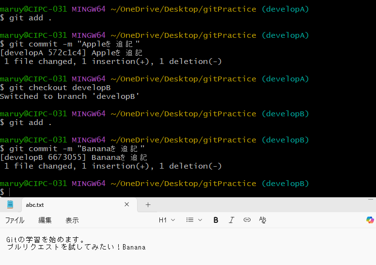 「developA」ブランチでは「Apple」、「developB」ブランチでは「Banana」と追記してそれぞれのローカルリポジトリにコミットします。