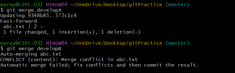 続いて、masterブランチにdevelopBをマージすると、ここでコンフリクトが起きます。