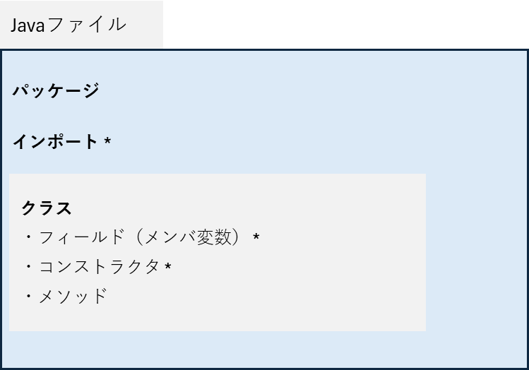 Javaファイルでは、下図のように、大きく分けて「パッケージ」「インポート」「クラス」があり、クラスの中には更に「フィールド」「コンストラクタ」「メソッド」といった要素があります。ここでは「*」印のついていないものについて簡単に触れていきます。