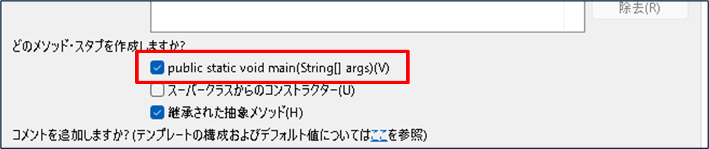 「Javaプロジェクトの作成」の単元でクラスを作成する際、「public static void main(String[] args)」にチェックを付けてJavaのクラスを作成したかと思います。
