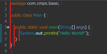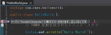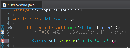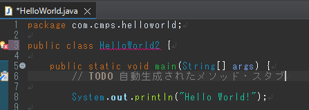 「Javaプロジェクトの作成」で作成したHelloWorld.javaで示すと、以下のようになります。