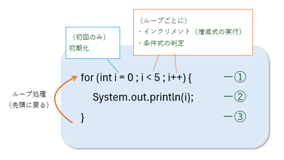 for(カウンタの初期値; ループ処理の条件式; 増減式){