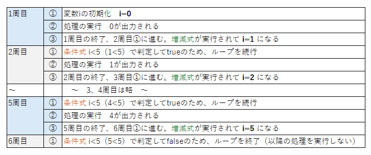 上記のことから今回のfor文は「0からスタートし(初期値)、5より小さい値まで(条件)、1ずつ足して(増減)、処理を繰り返す」ということを示します。