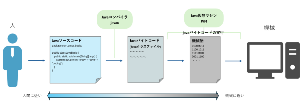 Javaはコンパイラ言語と書きましたが、実はコンパイラ言語とインタプリタ言語の両側面を持っているとも言えます。