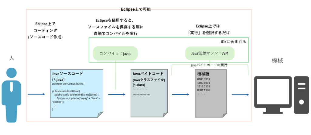 具体的には、Javaのプログラミングから実行までの操作は以下だけです。