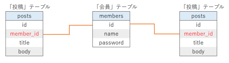 「個人情報」テーブルが持つmember_idには、membersテーブルのidの値が入ることを想定しています。