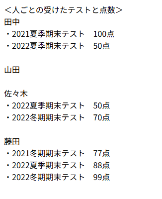 問2: 人ごとに、テストの点数を表示してください。