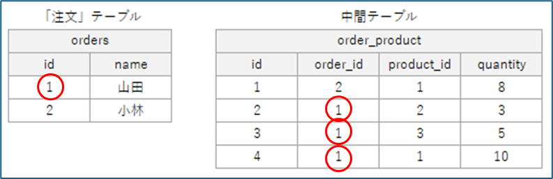 ①【Order】から【中間テーブル】にリレーション(OneToMany):orderのidが一致する中間テーブルのデータを取得