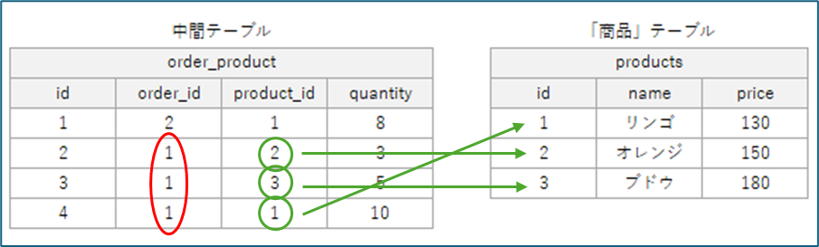 1つ目のOrderからProductへのリレーションを確認する orderToProduct()メソッド で言うと、
