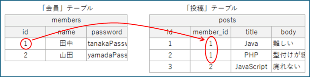 1対1の関係なので、会員テーブルのid列の値で個人情報テーブルのmember_id列を検索した場合、結果は一意に定まります。