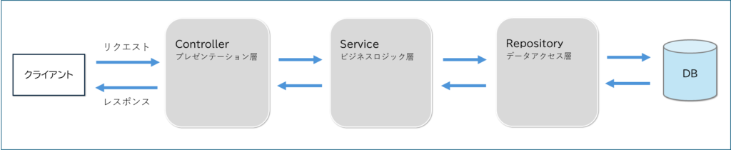 CotrollerからはServiceを呼び出し、ServiceからはRepositoryを呼び出す、という関係性ですね。