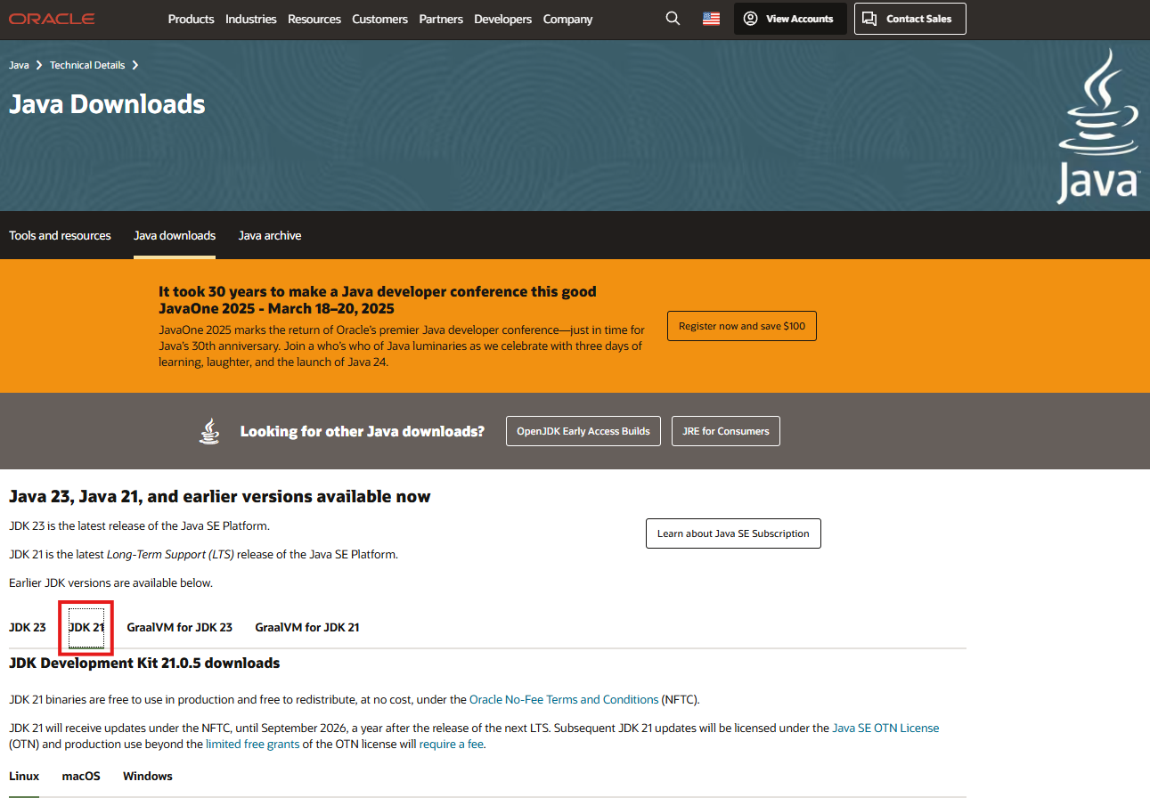 以下の画面からJDK21を選択します。