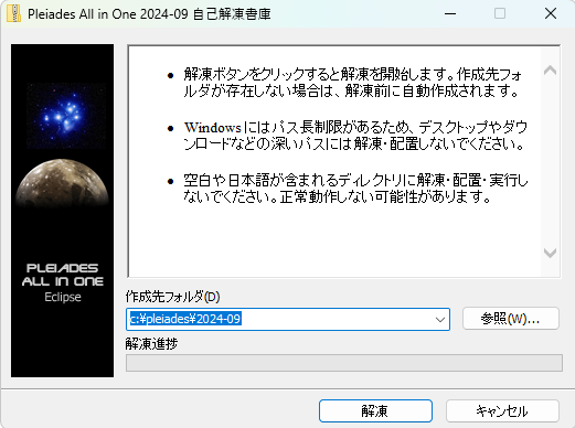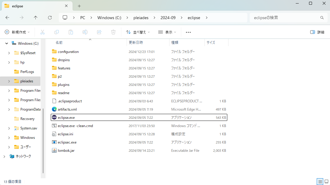 インストールされたファイルは特に変更していなければ以下のようなフォルダ状態になるかと思います。「Cドライブ→pleades→20XX-XX→eclipse→eclipse.exe」