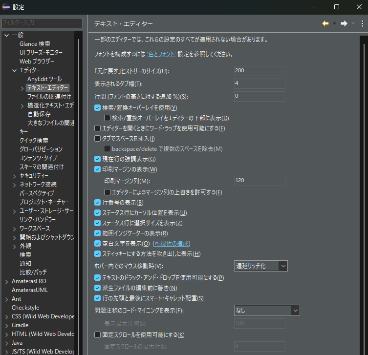 (2)[設定]ダイアログで、[一般]->[エディター]->[テキスト・エディタ]とツリーを選択し、ページ内にある[空白を表示]チェックボックスにチェックを入れます。