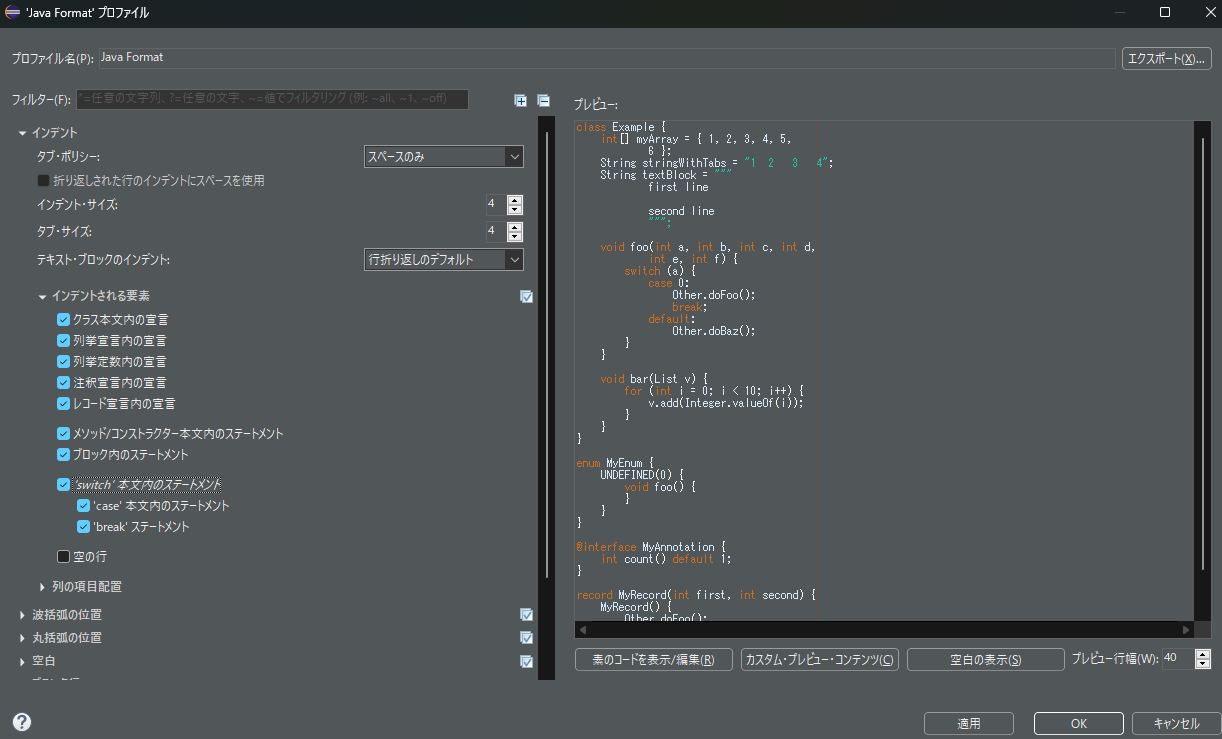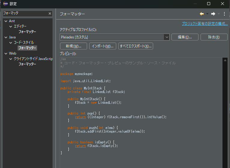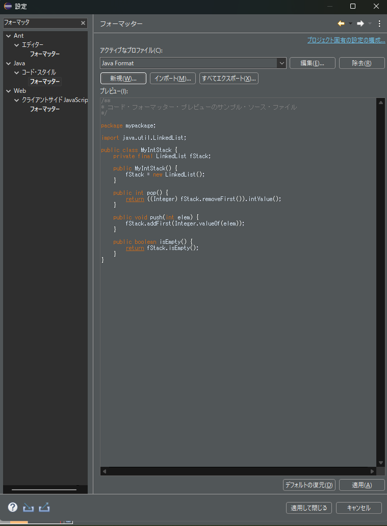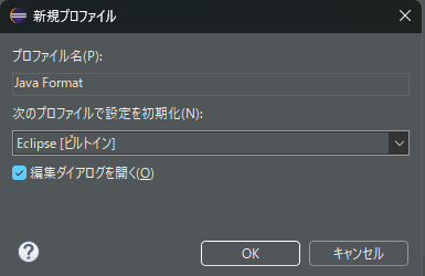 (3) [新規プロファイル]ウィンドウが開くので、プロファイル名に「Java Format」(任意)と入力して、