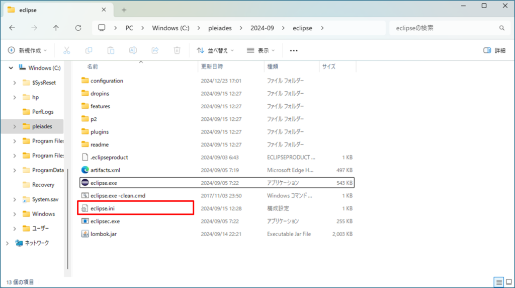 「eclipse」フォルダ内にある、「eclipse.ini」を開きます。